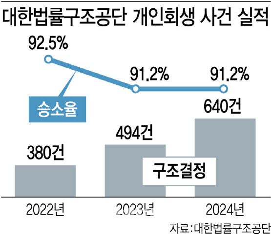 전국 법원의 개인회생 접수 건수는 2022년 8만 9966건에서 2024년 12만 9498건으로 44% 급증하는 등 개인회생을 통한 자구 노력이 늘고 있다. 반면 개인파산 접수는 2022년 4만 1463건에서 2024년 4만 104건으로 3.3% 감소했다.