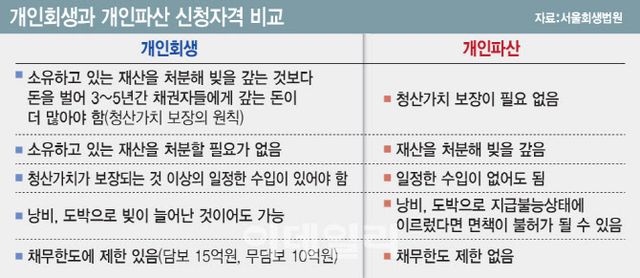 조용주 변호사(법무법인 안다)는 “내게 맞는 절차를 선택한다기보다는 현재 자산과 소득현황, 부채 증대경위를 종합적으로 고려해야 한다”며 “전문가 상담을 통해 조언받아 선택해야 한다”고 당부했다.
