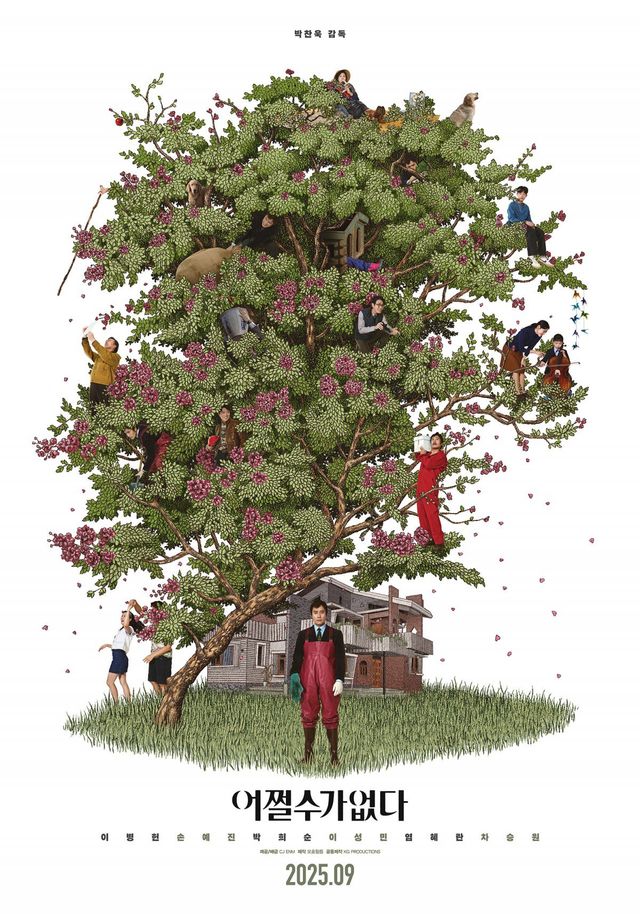 ‘어쩔수가없다’의 1차 포스터는 디테일이 돋보이는 일러스트 디자인으로 시선을 사로잡는다. 재취업을 위해 분투하는 ‘만수’와 특유의 에너지 넘치는 아내 ‘미리’(손예진), 부부의 두 아이 ‘시원’, ‘리원’과 반려견 두 마리가 곳곳에 자리한 가운데, 여유로운 표정의 ‘선출’(박희순), 종이를 응시하는 ‘범모’(이성민)와 피크닉을 즐기는 ‘아라’(염혜란), 구두를 들고 있는 ‘시조’(차승원)까지 배롱나무에 숨겨진 다양한 사연의 인물들이 호기심을 자극한다. 반드시 지켜내야 하는 집 앞에 서 있는 ‘만수’의 비장한 모습은, 흩날리는 꽃잎 속에서 ‘미리’와 춤을 추며 행복했던 한때의 ‘만수’와 대조를 이뤄, 갑작스러운 해고를 기점으로 펼쳐질 예측 불가한 상황에 대한 궁금증을 더한다.