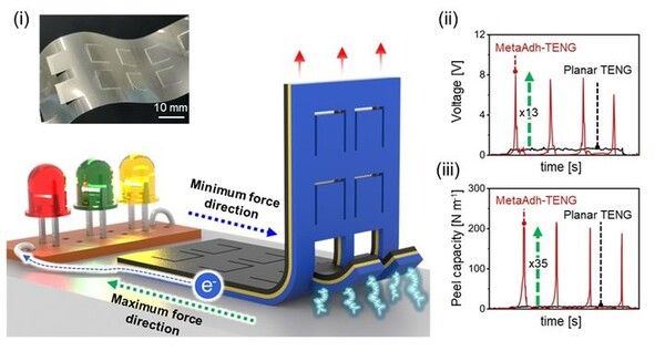 제1저자인 이희진 연구원은 "절개 패턴은 균열이 진행되는 방향을 제어하고, 순간적인 접착력을 높이는 역할을 한다"며 "특히 균열이 연결부에서 멈췄다가 반대 방향으로 다시 진행할 때 빠르게 분리되면서 전기 출력이 크게 증가하는 현상을 이용했다"고 설명했다.