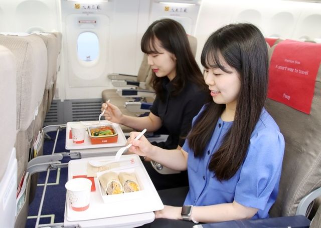 티웨이항공 탑승객이 장거리 노선에서 제공되는 순수 채식 기내식 메뉴를 맛보고 있다. ⓒ 티웨이항공