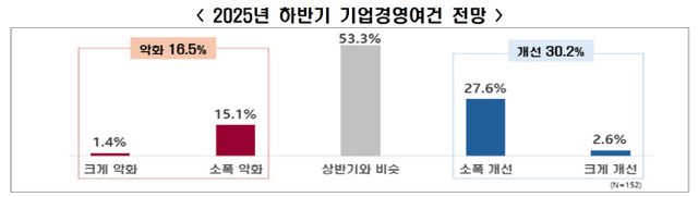 응답 기업 중 30.2%는 하반기 경영여건이 상반기 대비 개선될 것으로 전망했다. 상반기와 비슷할 것이라는 응답은 53.3%, 악화될 것이라는 전망은 16.5%로 조사됐다. 하반기 경영여건이 악화될 것으로 전망한 기업 중에서는 경영여건 개선 시점을 내년 1분기(40.0%)로 본 기업이 가장 많았다.