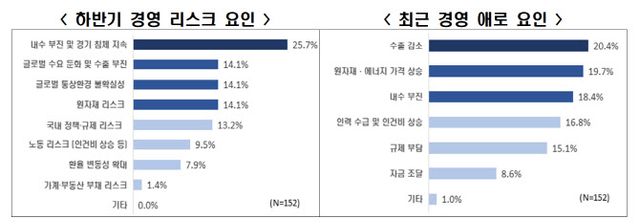 기업들은 하반기 최대 경영 리스크로 ‘내수부진 및 경기 침체 지속(25.7%)’을 지목했다. 이 밖에도 글로벌 수요 둔화 및 수출 부진(14.1%), 글로벌 통상환경 불확실성(14.1%), 원자재 수급 및 가격 상승 리스크(14.1%) 등을 꼽았다.