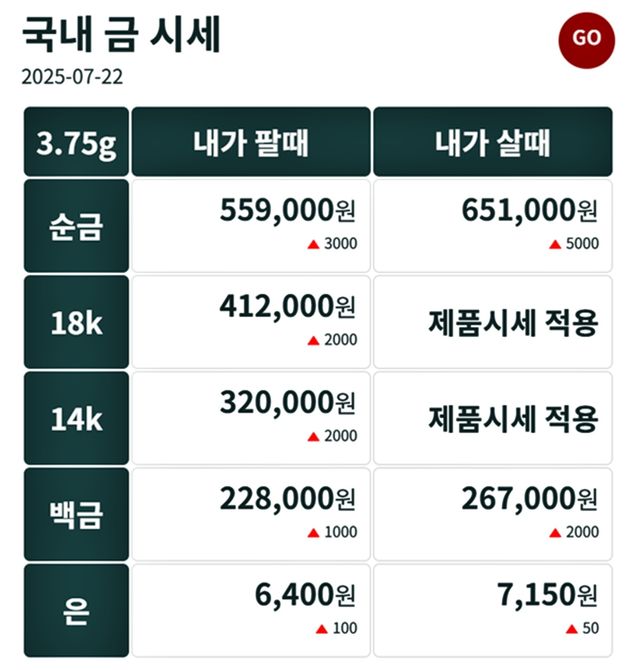 순금(24K) : 매입가 65만 1000원 / 매도가 55만 9000원