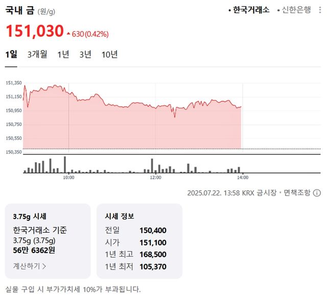 국내 금시세(금값)가 22일(한국 시각) 오후 상승세(전 거래일 대비)를 보이고 있다.