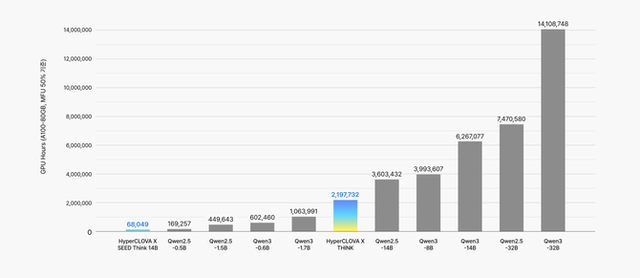 회사 측에 따르면, SEED 14B Think는 140억개 파라미터를 가진 모델임에도 불구하고, 오히려 5억 파라미터 규모의 글로벌 오픈소스 모델보다 더 적은 비용(GPU Hours)으로 학습됐다. 동일 크기의 글로벌 오픈소스 모델과 비교하면 1회 학습 비용이 약 100분의 1 수준에 불과하다.