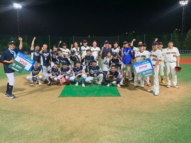 공놀이야(왼쪽)와 크루세이더스 선수들이 경기 후 파이팅을 외치고 있다. 공놀이야가 11-6 승리. MVP는 공놀이야 이몽주(맨왼쪽), 인기상은 크루세이더스 마경한(오른쪽에서 세번째). / 한스타미디어