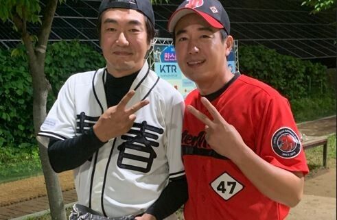 배우 이종혁(청춘야구단, 왼쪽)과 뮤지컬배우 김승회(인터미션)가 지난 21일 고양시 장항야구장에서 열린 더킴로펌배 제19회 한스타 연예인 야구대회 14주차 경기에 앞서 선전을 다짐하고 있다. /한스타미디어