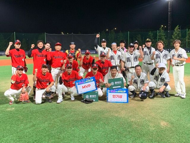 인터미션(왼쪽)과 청춘야구단 선수들이 경기 후 파이팅을 외치고 있다. 인터미션이 19-1로 승리. MVP는 인터미션 배우 최재웅, 인기상은 청춘야구단 배우 김기무가 차지했다. / 한스타미디어