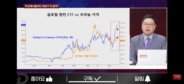 결론적으로는 지금 앞으로의 흐름에서 현재의 원전주들의 기대감이 현실화된다는 얘기는 역으로 말하면 우라늄에 대한 수요도 엄청 늘어날 거고 그러면 당연히 우라늄 가격도 계속 가야 되는데 지금 약간 벌어진 거는 조금 찜찜합니다.