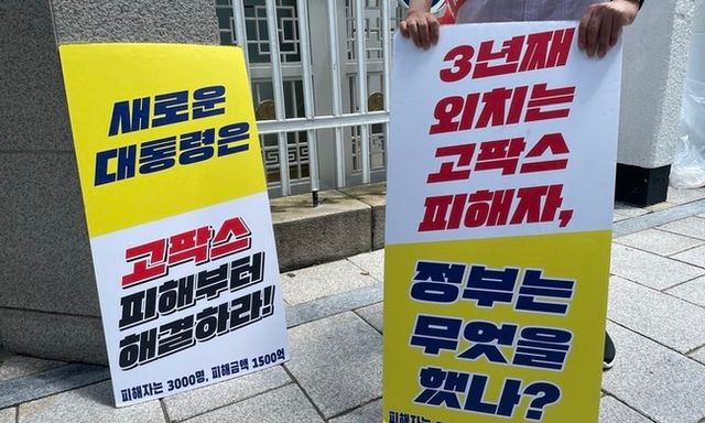 피해자들은 이날 서울 종로구 정부서울청사 앞에서 사태 해결 촉구 시위를 진행했다. 시위에 동원된 피켓에는 '새로운 대통령은 고팍스 피해부터 해결하라' '3년째 외치는 고팍스 피해자, 정부는 무엇을 했나?' 등의 문구가 적혔다.