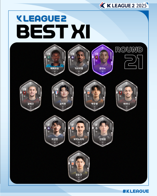 K리그2 베스트 11에는 부천이 몬타뇨, 바사니, 갈레고 등 외국인 선수를 배출해냈고, 화성FC가 박주영, 보이노비치, 김승건 등을 올리며 부천과 최다 배출 팀이 됐다. 그밖에 가브리엘, 이강한(이상 충북청주FC), 제페르손(안산그리너스), 김지현(수원), 신재원(성남) 등이 자리했다.