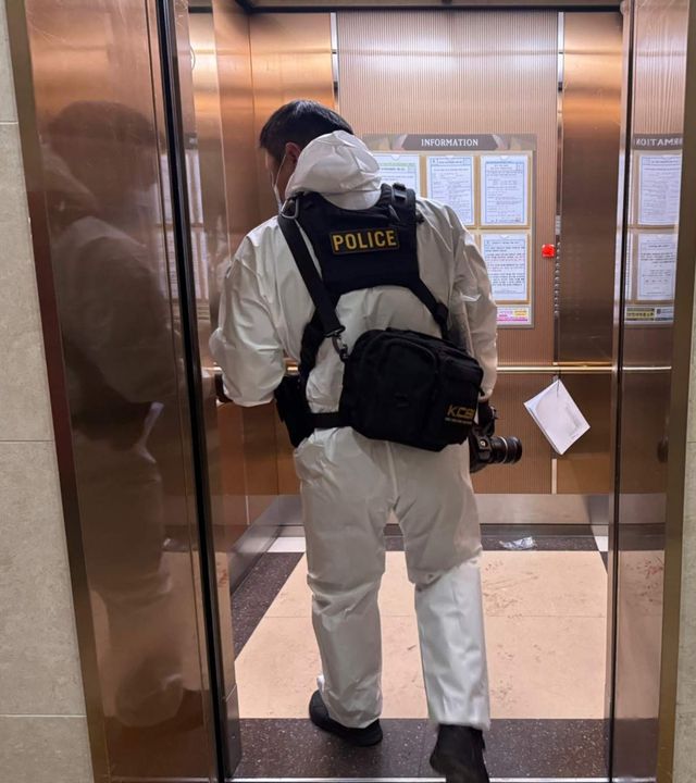 지난 20일 총기 사고가 발생한 인천 연수구 한 아파트 단지에 경찰 수사관이 엘리베이터를 타고 들어가고 있다. / 뉴스1