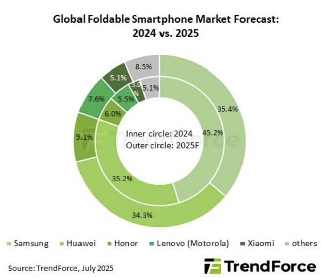 2위는 화웨이로 34.3%의 점유율을 확보할 것으로 예상된다. 또 다른 중국업체 아너의 경우 최근 성장세를 보이면서 지난해 점유율 6.0%에서 올해 9.1%까지 높아질 것으로 트렌드포스는 추정했다. 최근 컴팩트 폴더블 시장을 겨냥하고 있는 샤오미도 같은 기간 점유율이 3%에서 6.1%로 상승할 전망이다.
