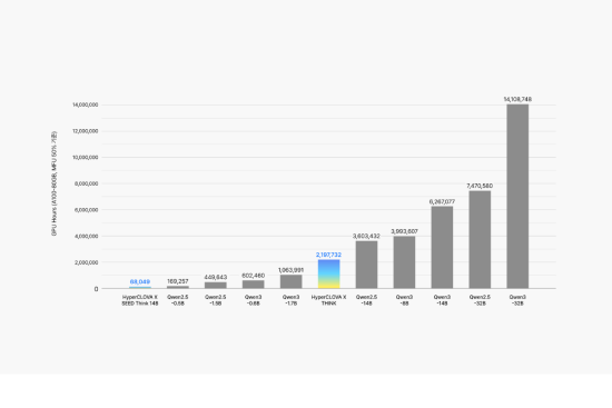 회사 측에 따르면, 해당 모델은 140억 개 파라미터 규모의 모델임에도 불구하고, 5억 개 파라미터로 구성된 글로벌 오픈소스 모델보다 더 적은 비용(GPU Hours)으로 학습됐다. 동일 크기 글로벌 오픈소스 모델과 비교하면 1회 학습 비용은 약 100분의 1 수준이다.