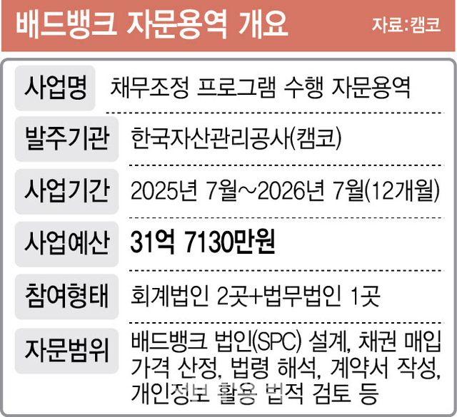22일 금융권에 따르면 캠코는 최근 ‘장기 연체채권 채무조정 프로그램 수행 자문용역’을 공고했다. 자문용역 기간은 계약 체결 즉시부터 내년 7월까지 1년간이며 사업예산은 31억 7130만원이다. 회계법인 2곳과 법무법인 1곳이 컨소시엄 형태로 자문을 맡는다. 채권 매입 가격 산정, 배드뱅크 법인(SPC) 설립, 법령 해석, 금융회사와의 계약서 작성 등 사업 전 과정에 대해 외부서 자문받겠다는 것이다.