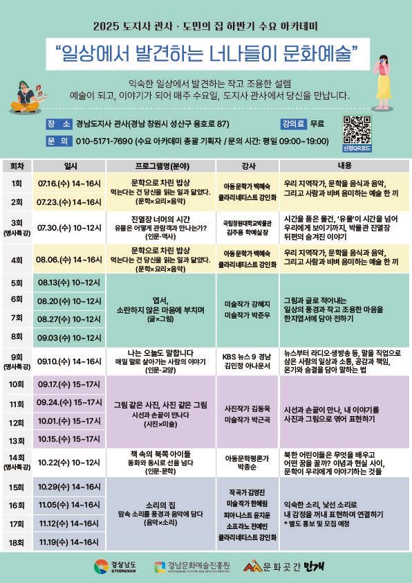 경상남도와 경남문화예술진흥원은 도민의 인문·예술적 소양 증진을 위한 '2025년 하반기 수요 아카데미'를 옛 도지사 관사에서 지난 16일부터 11월 19일까지 18회 운영한다고 22일 밝혔다.