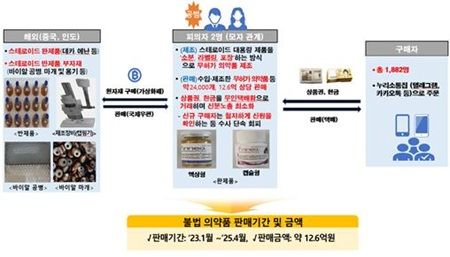 수사결과, 피의자들은 2023년 1월부터 2025년 4월까지 해외에서 수입하거나 직접 제조한 무허가 스테로이드, 성장호르몬, 에페드린 등 약 2만 3,000개, 12억 4,000만원 상당 의약품을 누리소통망(SNS)을 통해 판매해왔다.