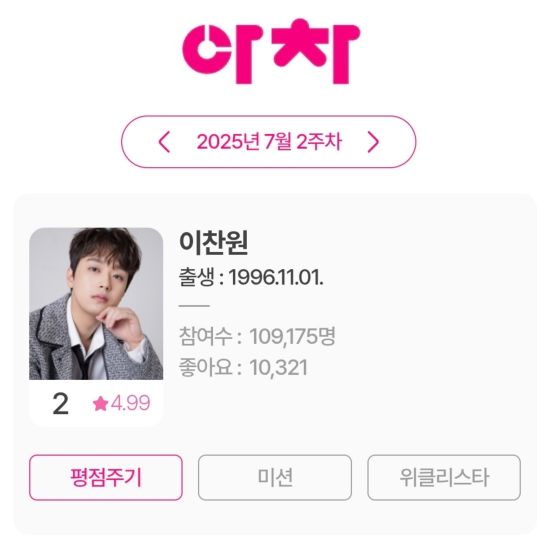 (엑스포츠뉴스 이정범 기자) 이찬원이 아이돌차트 평점랭킹에서 179주 연속 2위를 기록했다.
