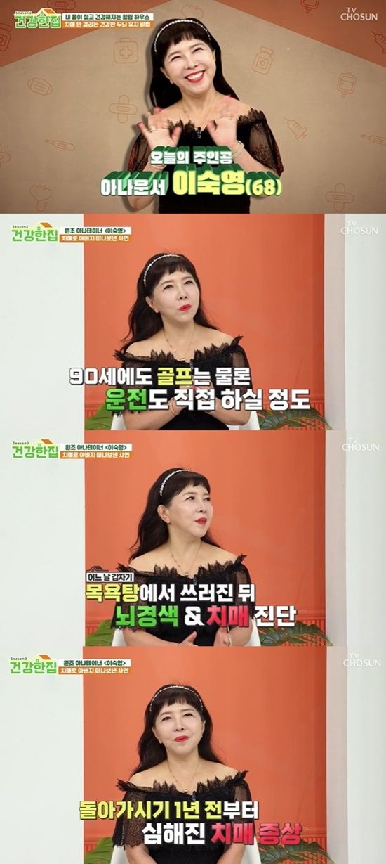 이숙영은 "아버지가 이비인후과 전문의셨고, 90세에도 골프를 치고 운전을 하시고 패션 감각도 뛰어나셨는데 목욕탕에서 쓰러지신 뒤 뇌경색과 치매 진단을 받으셨다. 돌아가시기 1년 전부터 치매 증상이 심해지셨고, 옛날 기억은 잘 하시는데 단기 기억력이 떨어지시더라"고 돌아봤다.