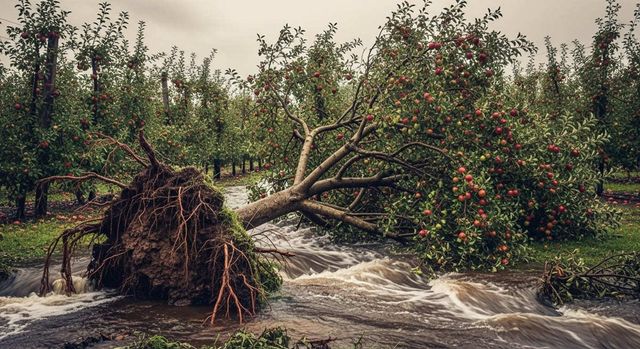 침수 피해는 과일뿐만 아니라 나무 전체의 생육에도 영향을 준다. 뿌리가 침수되면 산소 부족으로 인해 근권이 약해지고 이는 곧 수분과 영양분 흡수 능력 저하로 이어진다. 이에 따라 나뭇잎이 누렇게 변하거나 낙엽이 일찍 떨어지는 증상이 나타난다.