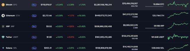 23일 글로벌 가상자산 시황중계 사이트 코인마켓캡에 따르면 이날 오전 8시 7분 기준 비트코인 가격은 24시간 전 대비 2.29% 오른 11만 9979달러를 기록했다. 일주일 전과 비교하면 1.75% 올랐다. 오전 8시 22분 기준으로는 전일 대비 2.55% 오른 12만 166달러를 기록하며 12만 달러를 넘어섰다. 알트코인(비트코인 외 가상자산)의 대표격인 이더리움은 전일 대비 1.17% 하락한 3721달러에 거래됐다.