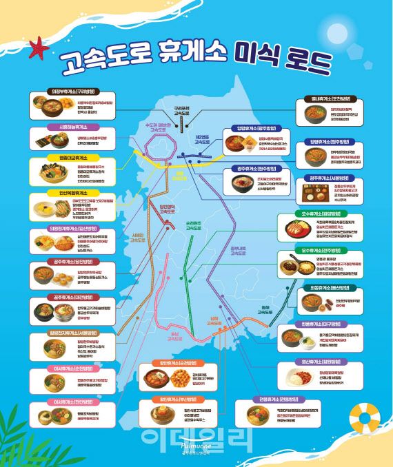 영동고속도로 안산복합휴게소에서는 대부도 포도고추장을 활용한 ‘대부도고추장 보자기비빔밥’과 경기미소팝코야키, 인천국제공항고속도로 영종대교휴게소에서는 서해안 해산물을 듬뿍 넣은 ‘을왕리해물칼국수’와 인천의 지역 간식인 ‘인천샌드’를, 광주원주고속도로 경기광주휴게소(광주·원주방향)에서는 진한 국물의 ‘곤지암 소머리곰탕’을, 양평휴게소(광주·원주방향)에서는 ‘양평서울해장국’과 ‘크리스피 리얼해물칩’을 선보이고 있다.
