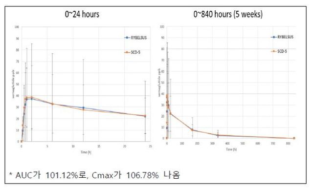 최고혈중농도(Cmax) 및 약물 노출량(AUC) 수치가 오리지널 대비 100% 수준으로 일치했다.