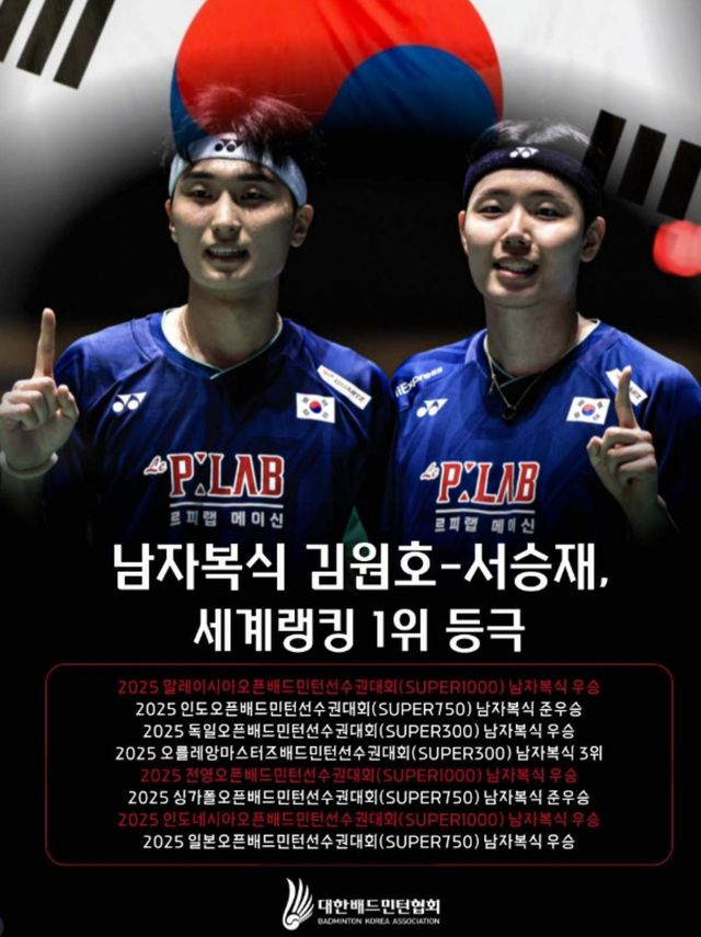 한국 배드민턴은 안세영 외에도 또 한 쌍의 '세계 최강'을 보유하게 됐다. 남자 복식 서승재-김원호 조가 세계 랭킹 1위에 올랐기 때문이다. 한국 남자 복식조가 세계 정상에 오른 건 2016년 11월 이용대-유연성 조 이후 약 9년 만이다.