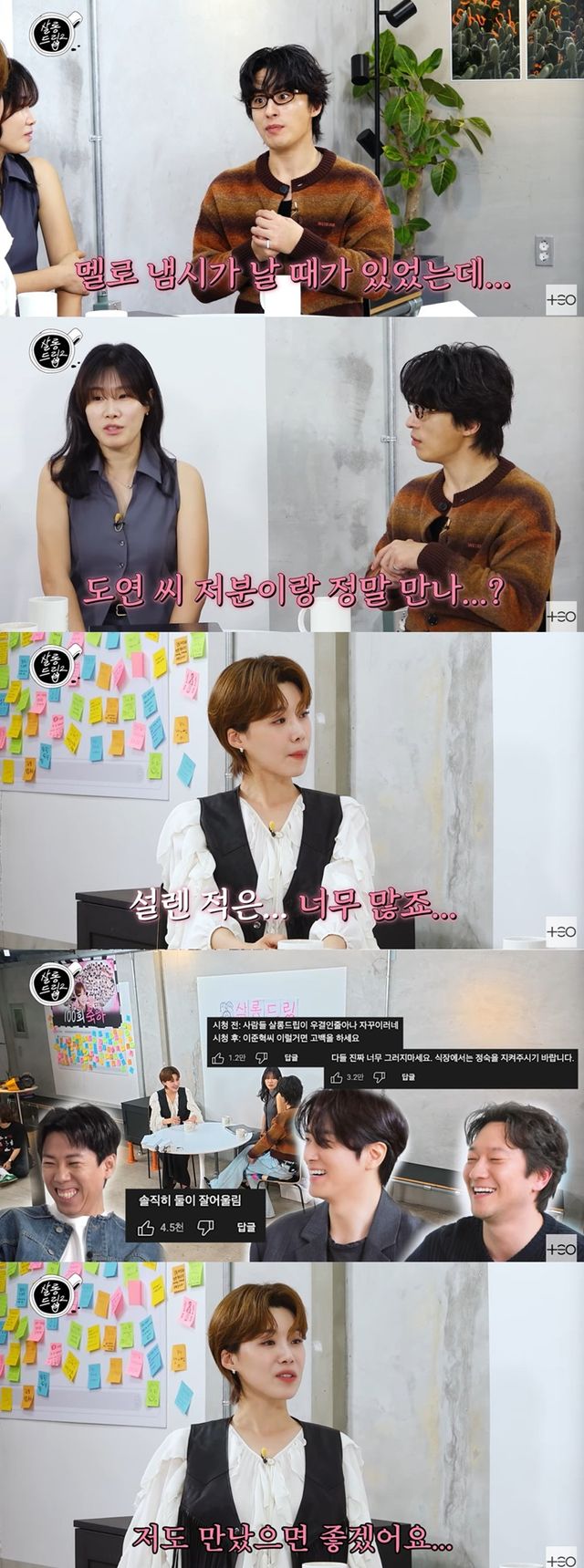 이옥섭 감독은 "(구교환이) 저에게 물어보기도 한다. '도연 씨 저 분이랑 정말 만나?'하더라"라고 덧붙였고, 화면에는 양세찬, 이준혁, 손석구와 장도연의 러브라인을 미는 구독자들의 댓글이 차례로 비춰졌다.