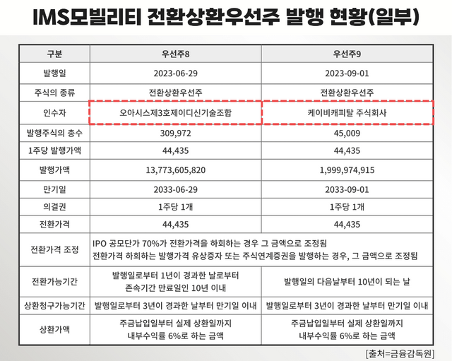 KB캐피탈이 매입한 주식의 가격은 오아시스펀드가 매입한 주식과 동일하게 책정됐으며 상환·전환 조건 또한 거의 동일했다. KB캐피탈과 오아시스펀드가 매입한 상환전환우선주의 상환청구가능기간은 전부 '발행일로부터 3년이 경과한 날부터 만기일 이내'였으며 상환가액 역시 '주금납입일부터 실제 상환일까지 내부수익률 6%로 하는 금액' 등으로 똑같았다. KB캐피탈 역시 펀드 투자에 동참하려했던 의도였으나 어떤 사정에 의해 늦춰진 것으로 분석되는 대목이다. 실제 IMS측은 "당초 펀드에 함께 참여하려고 했는데 내부 의사 결정이 늦어져 따로 투자하게 된 것이다"는 입장을 밝힌 것으로 알려졌다.
