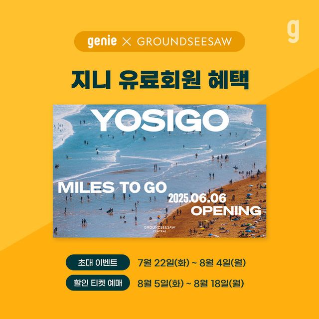 지니는 오는 8월4일까지 AI 큐레이션 기술을 활용한 35곡의 테마 음악 플레이리스트를 공개한다. 요시고 사진전의 7개 전시 섹션에서 영감을 받은 키워드를 바탕으로 선곡된 감성 음악으로 구성됐으며, 감상 후 이벤트에 응모한 지니 회원 중 100명(1인 2매)에게 전시 초대권과 엽서를 증정한다.