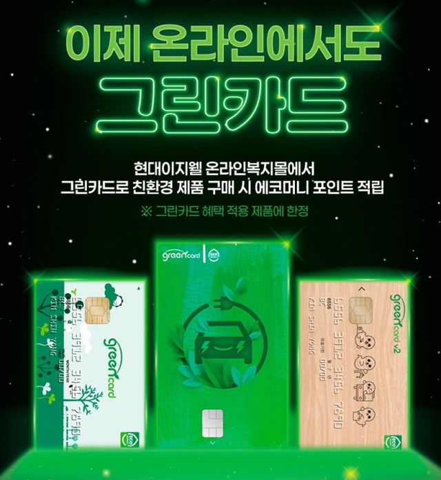 '그린카드'란 일상 생활 속에서 친환경 생활을 실천하는 소비자에게 에코머니 포인트 등 경제적 인센티브를 제공하는 친환경 소비 촉진 정책이다. 기존 오프라인 가맹점에서만 제공되던 인센티브 적립 서비스를 현대이지웰이 처음으로 온라인까지 확대해 선보이는 것으로, 그린카드 온라인 적립 서비스는 고객이 현대이지웰 온라인 복지몰에서 환경표지 인증제품·저탄소제품·친환경 인증 농산물 등 적립대상 상품을 그린카드(신용·체크카드)로 구매 시 구입액의 5~25%를 에코머니 포인트로 적립해 준다. 적립된 에코머니 포인트는 다양한 사용처에서 현금처럼 사용할 수 있다.