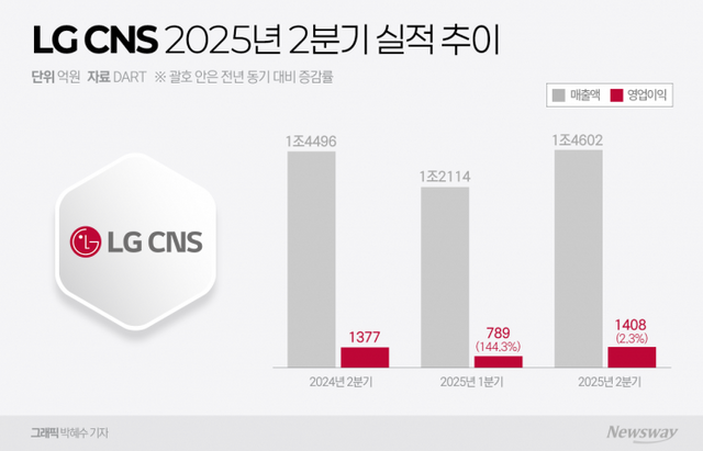 LG CNS는 2분기 연결 기준 매출 1조 4602억원, 영업이익 1408억원을 기록했다고 23일 밝혔다. 전년 동기 대비 각각 0.7%, 2.3% 증가한 수치로, 시장 기대치(컨센서스)를 웃돌았다. 상반기 누적 기준으로는 매출 2조6715억원, 영업이익 2197억원으로 전년 대비 각각 6%, 29.2% 성장했다.