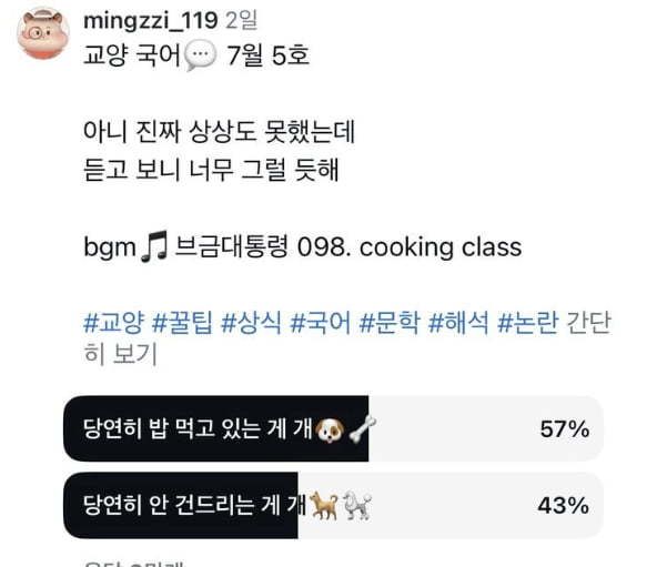 밥 먹을땐 개도 안 건드린다 속담 해석 투표 / 인스타그램 'mingzzi_119' 캡처