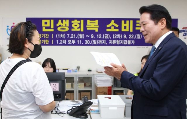 | ▲ 최대호 안양시장은 23일 비산1동 행정복지센터 민생회복 소비쿠폰 창구를 방문해 시민들에게 소비쿠폰을 안내하고 의견을 청취했다. |