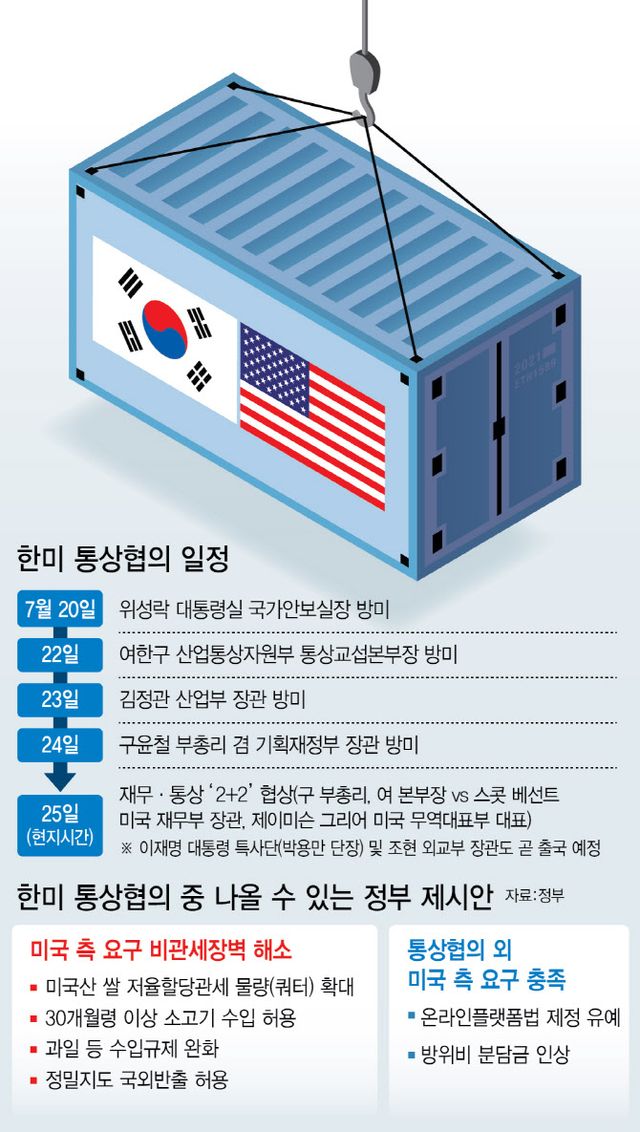 이 대통령의 친서를 전달할 박용만 특사단 단장(전 대한상공회의소 회장)과 조현 외교부 장관도 곧 미국을 찾는다. 경제팀 전원이 25일 담판을 앞두고 ‘올 코트 프레싱’에 나선 모습이다. 이들은 한-미간 상황을 실시간 공유하며 협상 카드를 조율 중으로 알려졌다.