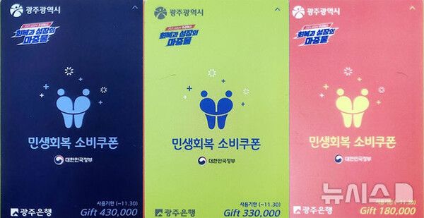 한편 광주시가 현재 지급하고 있는 소비쿠폰 선불카드는 일반용(분홍색)과 한부모가정(초록색)·기초생활수급자(남색) 3종으로 구분돼 있다. 각 18만·33만·43만원이 충전돼 있다.