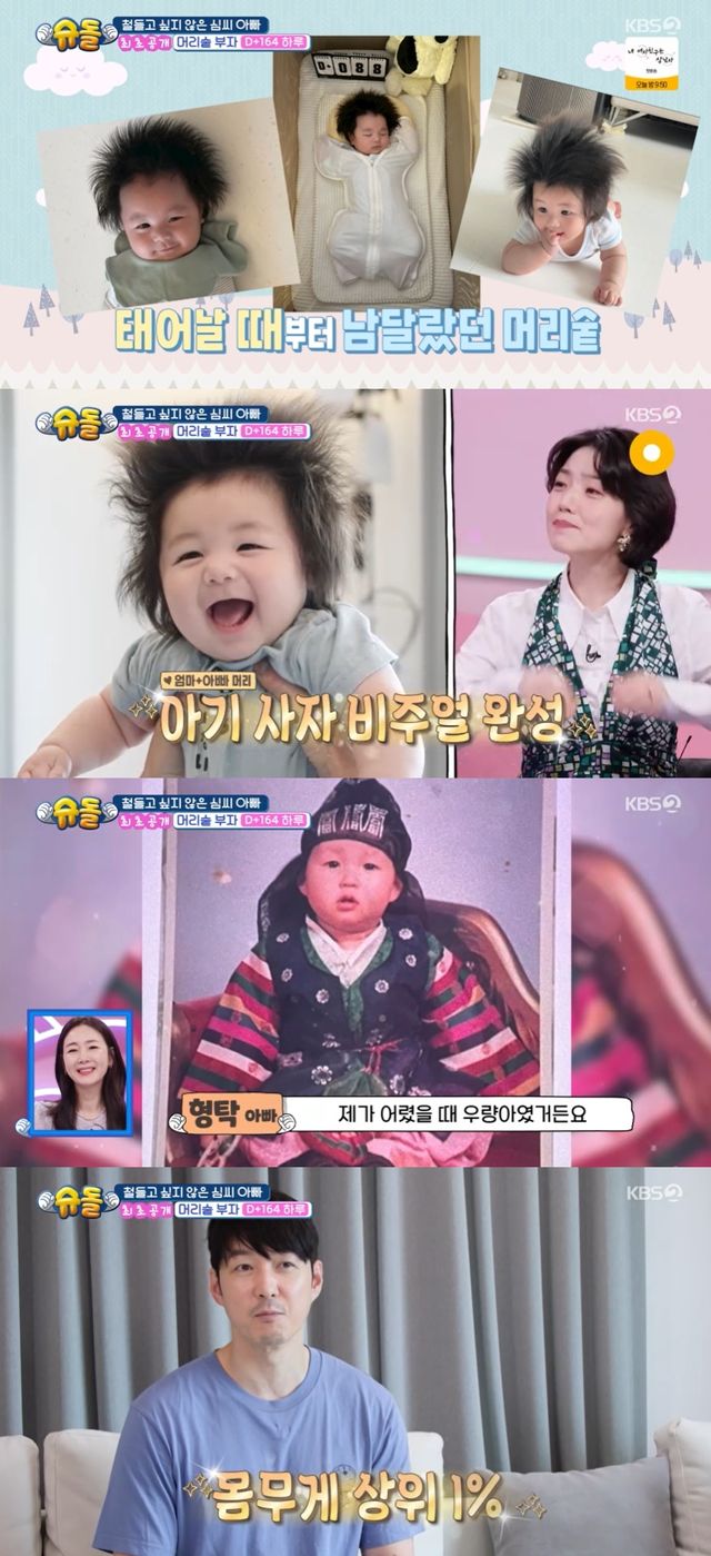 심형탁은 "엄마가 윗머리가 섰고 제가 옆머리가 섰는데 둘이 합쳐졌다"라고 말했고, 이를 본 최지우는 "아기 사자 같다. 아기 사자 갈기처럼"이라며 감탄했다.