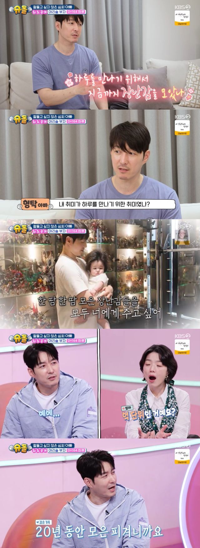 심형탁은 "왜냐하면 저 장난감들은 이제 전부 하루 것이 된다. 하루가 말 잘 듣고 좋은 일 하면 하나씩 계속 줄 거다"라며 자신이 모은 피규어를 전부 아들 하루에게 줄 거라고 밝혔다.