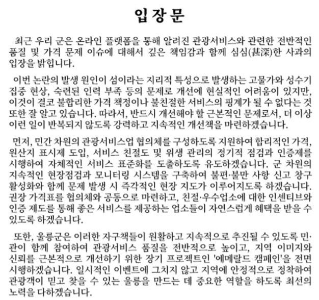 또 “문제가 된 부분에 대해서는 절차를 밟고 있고, 즉각조치사항과 장·단기 과제로 구분해 전력을 다해 해결하겠다”라며 “조금 부족해도 친절과 서비스 정신으로 무장 한다면 이해를 넘어 다시 사랑을 받을 수 있으리라 믿는다. 울릉도와 독도를 많이 사랑해 주시고 다시 찾을 수 있도록 군민 여러분과 함께 잘 준비하겠다”고 전했다.
