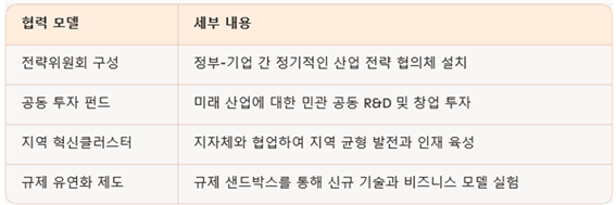 정부는 연구개발(R&D) 지원과 인프라 제공, 기업은 기술개발과 시장 확장에 집중하는 협력 모델이 효과적이다. 이를 통해 글로벌 경쟁력을 높일 수 있다.