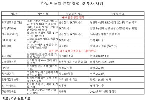 일본기업은 반도체 제조 장치의 세계시장 점유율이 약 20%, 관련 소재 점유율이 50% 정도에 달한다. 한국이 차세대 메모리 반도체나 AI 반도체를 개발하면서 차세대 공정 기술인 칩릿(각종 반도체를 블록처럼 모듈화한 집적회로) 등을 성공적으로 개발하기 위해서는 일본기업과의 협력이 매우 중요한 이유다.
