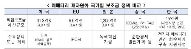 한국은 주요국 대비 폐배터리 재자원화 관련 정책과 예산이 제한적이다. 지난해부터 추진된 한국환경공단의 전기차 폐배터리 회수체계 구축 지원사업의 총예산은 15억원으로, 미국(4조 원), 일본(1조8000억원) 등 주요국 대비 현저히 낮다.
