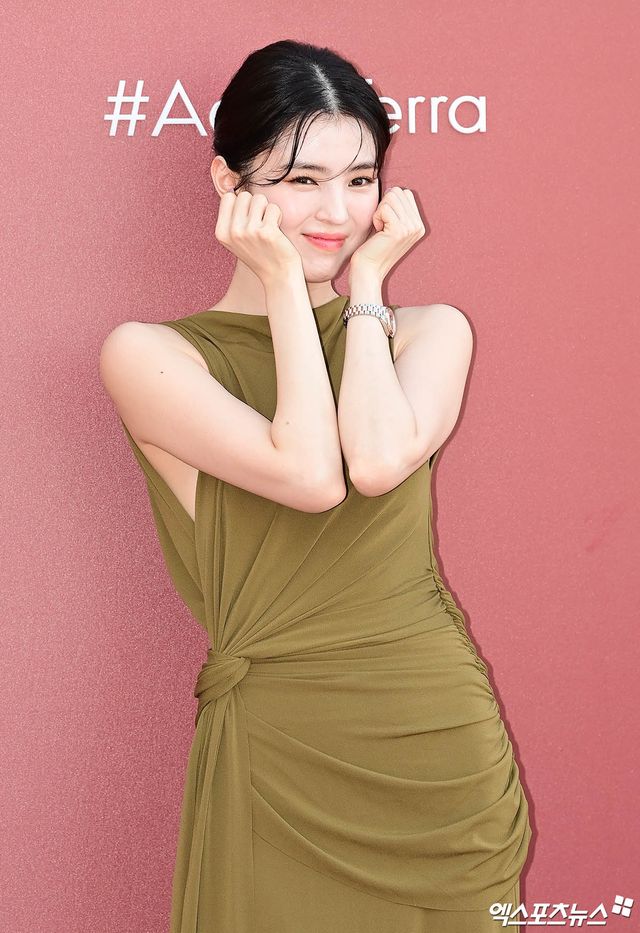 한쪽 허리 라인을 따라 잡힌 셔링 디테일은 슬림한 보디라인을 강조했고, 군더더기 없이 떨어지는 플로어 길이의 드레스는 고요하면서도 클래식한 무드를 연출했다. 드레스와 조화를 이루는 메탈 시계는 절제된 포인트로, 전체적인 스타일링에 세련된 감각을 더했다.