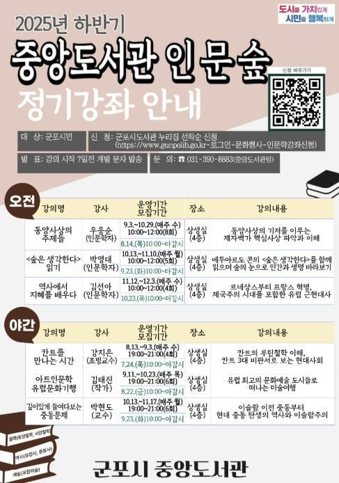 [와이뉴스] 군포시 중앙도서관은 시민들의 인문학적 소양을 함양하고자 2025년 하반기 인문학 프로그램인 ‘중앙도서관 인문숲’ 강좌를 운영한다.