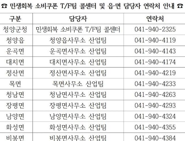 | ▲ 민생회복 소비쿠폰 T/F팀 콜센터 및 읍면 담당자 안내 |
