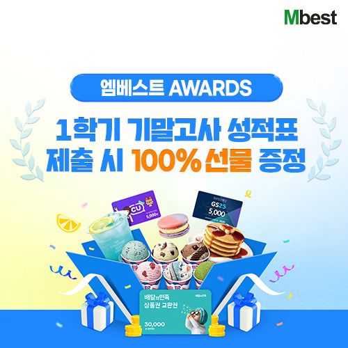 ‘엠베스트 어워즈’는 엠베스트 수강 이력이 있는 중 1~3학년 회원이라면 누구나 참여할 수 있으며, 1학기 기말고사 성적표를 제출하면 다양한 혜택이 제공된다.