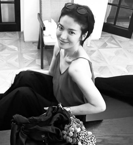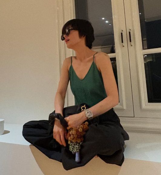 송혜교는 23일 지인들과 함께 식사하고 대화하며 남긴 여유로운 일상 사진을 공개했다. 사진 속 그는 슬립 스타일의 초록색 상의에 검은색 와이드 팬츠를 매치해 스타일리시한 패션을 완성했다. 귀여운 키링을 더한 백과 선글라스를 더해 시크하면서도 힙한 느낌을 자아냈다.