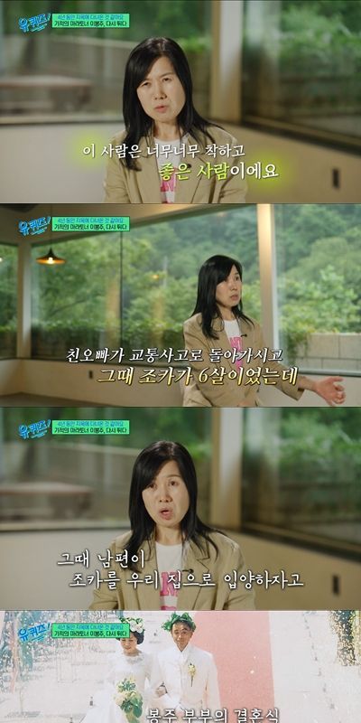아내는 "오빠가 교통사고로 돌아가시고, 그 아이가 그때 6살이었는데 남편이 아이를 우리 집에서 데리고 키우자고 하더라. 그게 사실 쉬운 게 아니다. 그 제안을 남편이 했고, 자기 조카한테 너무너무 잘해줬다. 아들이었다"며 두 부부의 결혼식 화동이기도 했던 조카를 정식 입양하자고 한 이봉주를 언급했다.